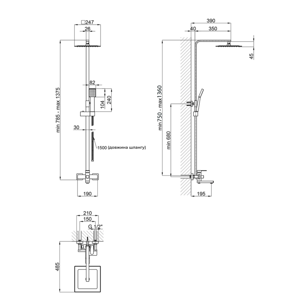 Душова система оснащена телескопічною стійкою, яка регулюється в діапазоні від 690 до 1400 мм.