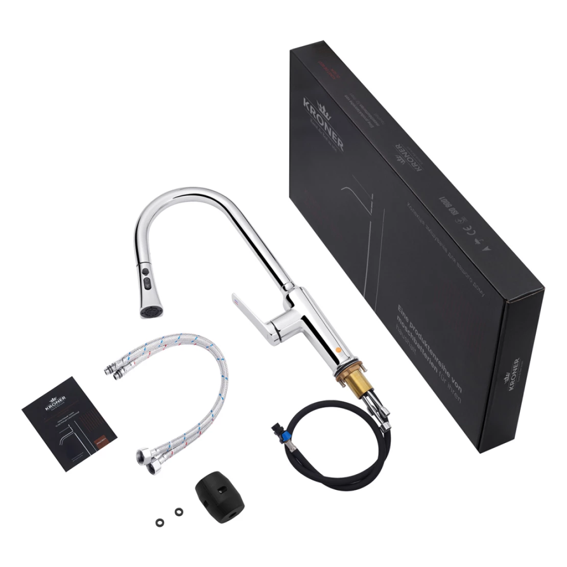 Змішувач, гнучка підводка, шланг для висувної лійки, лійка, якір, кріплення |